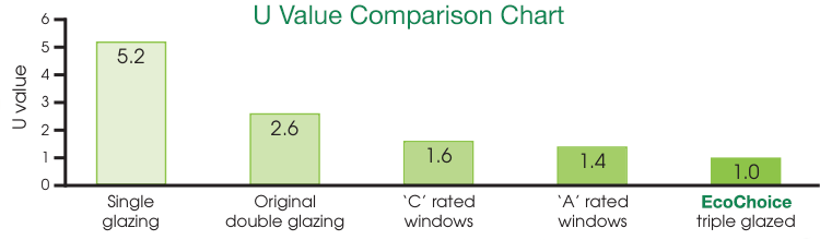 When comparing double glazing to triple glazing, the key technical difference lies in the “U value,” which measures how well a window prevents heat from escaping. The lower the U value, the better the insulation performance. Secure Windows & Doors triple glazed windows achieve a U value of 1.0 as standard, demonstrating superior thermal efficiency. In comparison, a window with a “C” energy rating typically has a U value of 1.6, while an “A” rated window averages around 1.4. This means triple glazing offers noticeably improved insulation, helping you save more on energy costs over time.